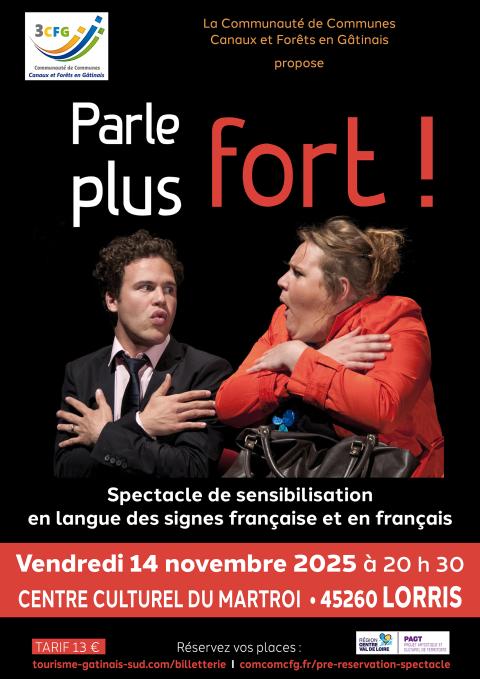PARLE PLUS FORT ! est un spectacle de sensibilisation (en langue des signes française et en français), mis en scène par Jean-Yves Augros avec Thomas Lévêques et Fanny Maugard.