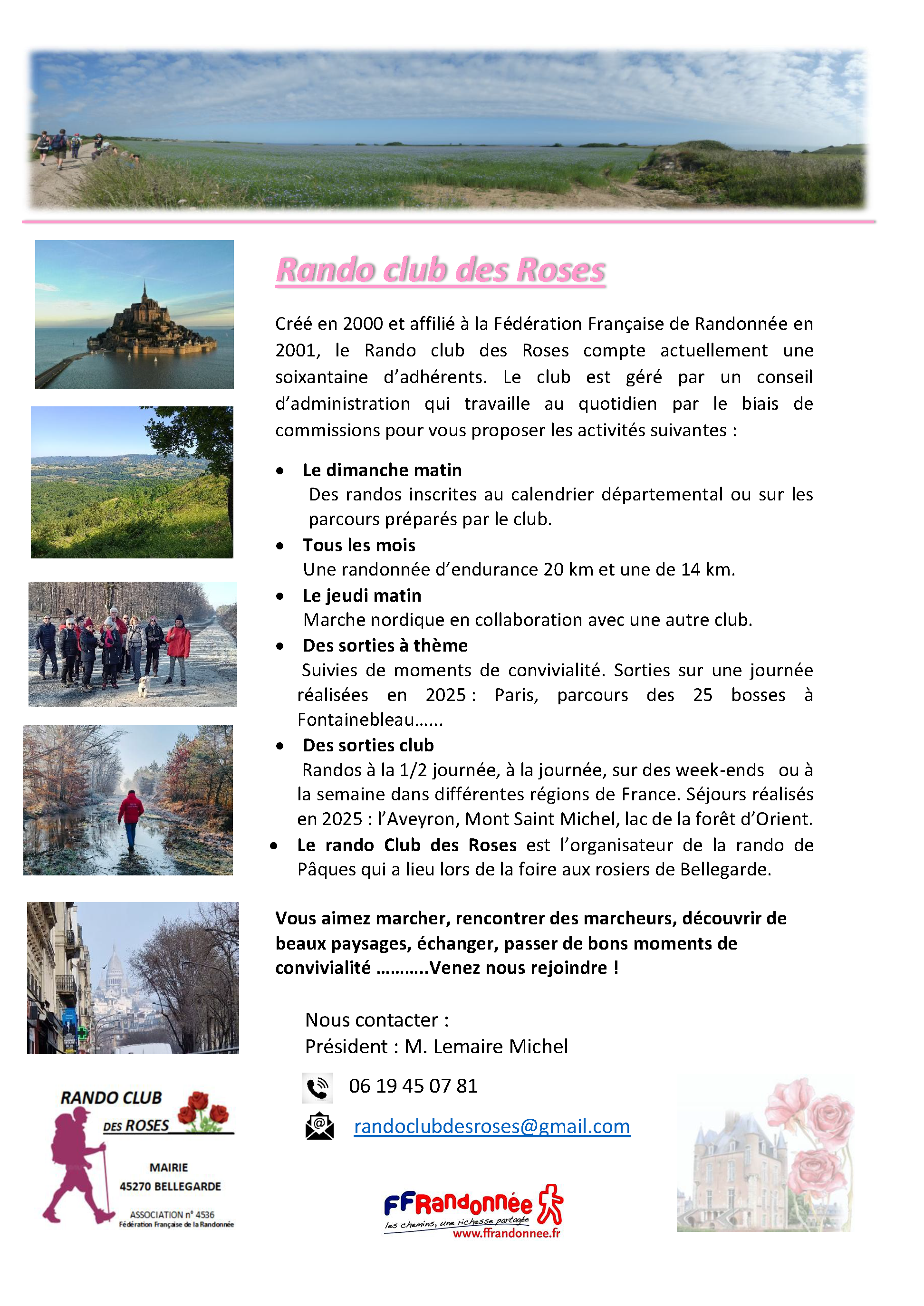 Contacts : Michel Lemaire | Président du Rando Club des Roses | 📩 randoclubdesroses@gmail.com | 📞 06 19 45 07 81